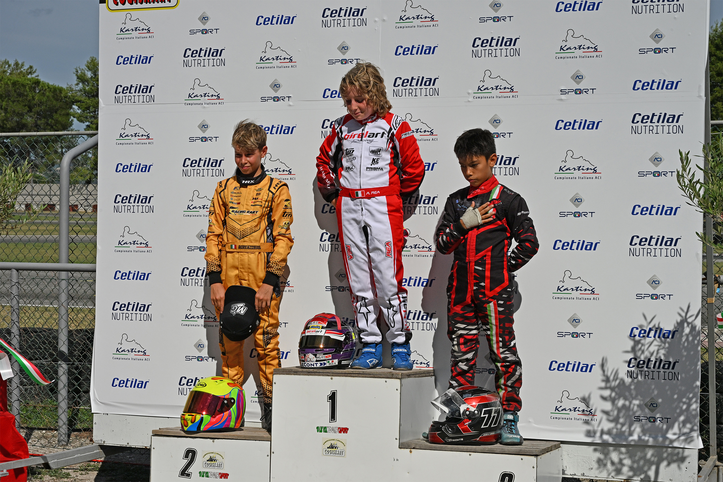 Nella 60 Mini Edoardo Mario Sulpizio scattato dalla pole in finale 1, coinvolto in un incidente parte dalle retrovie e risale al 5° posto. In gara 2 a griglia invertita scatta quarto e vince una gara da brividi, con velocità, determinazione e grinta, conquistando il titolo di CAMPIONE ITALIANO, primo per i colori giallo-nero TK.